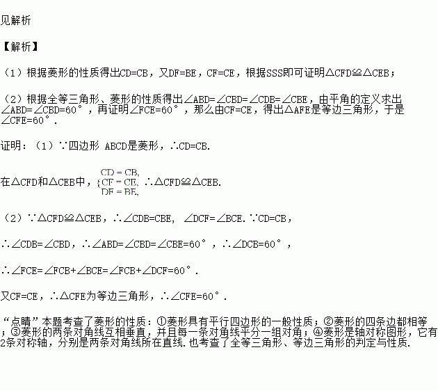 如图,在菱形ABCD中,F为对角线BD上一点,点E为AB延长线上一点,DF=BE,CE=CF.求证: