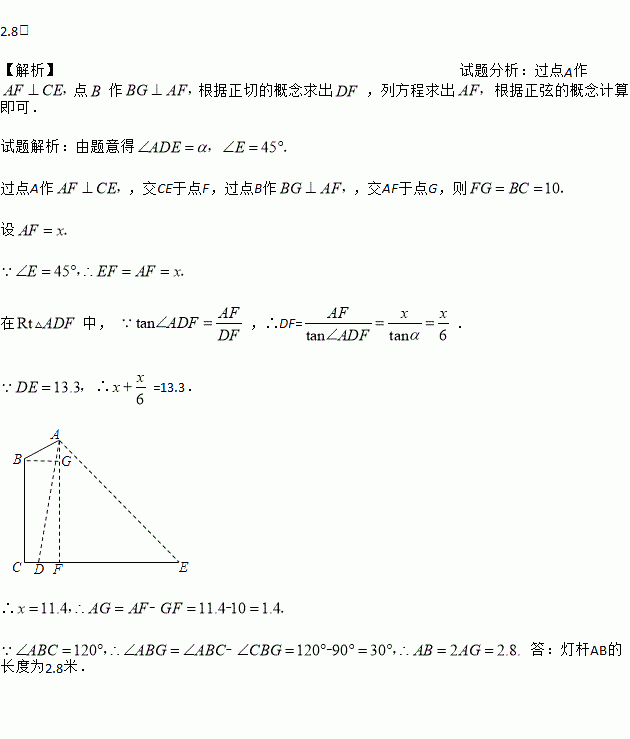 如图是某路灯在铅垂面内的示意图,灯柱BC的高为10米,灯柱BC与灯杆AB的夹角为120°.路灯采用锥形灯罩,在地面上的照射区域DE的长为13.3米,从D、E两处测得路灯A的仰角分别为α和45°,且tanα=6.求灯杆AB的长度.
