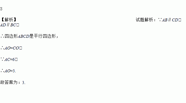 如图,在四边形ABCD中,AB∥CD,AD∥BC,AC,BD相交于点O.若AC=6,则线段AO的长度等于________.