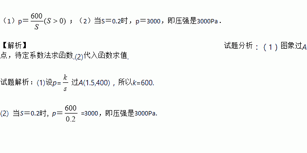 (1)p=;(2)当S=0.2时,p=3000,即压强是3000Pa. 【解析】试题分析:(1)图象过A点,待定系数法求函数.(2)代入函数求值. 试题解析:(1)设p=过A(1.5,400),所以k=600. (2) 当S=0.2时, p==3000,即压强是3000Pa.