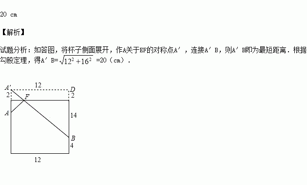 如图,圆柱形容器高为18cm,底面周长为24cm,在杯内壁离杯底4cm的点B处有乙滴蜂蜜,此时一只蚂蚁正好在杯外壁,离杯上沿2cm与蜂蜜相对的点A处,则蚂蚁从外币A处到达内壁B处的最短距离为 .