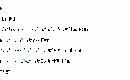B. 【解析】 试题解析:A、a·a5÷a4=a2,该选项计算正确; B、a3÷a=a2,故该选项错误 C、x2÷(-x)2=x2÷x2=1,故该选项计算正确; D、x3÷x·x2=x4,故该选项计算正确. 故选B.