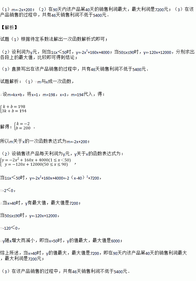 ①该产品90天内日销售量(m件)与时间(第 x天)满足一次函数关系,部分数据如下表: