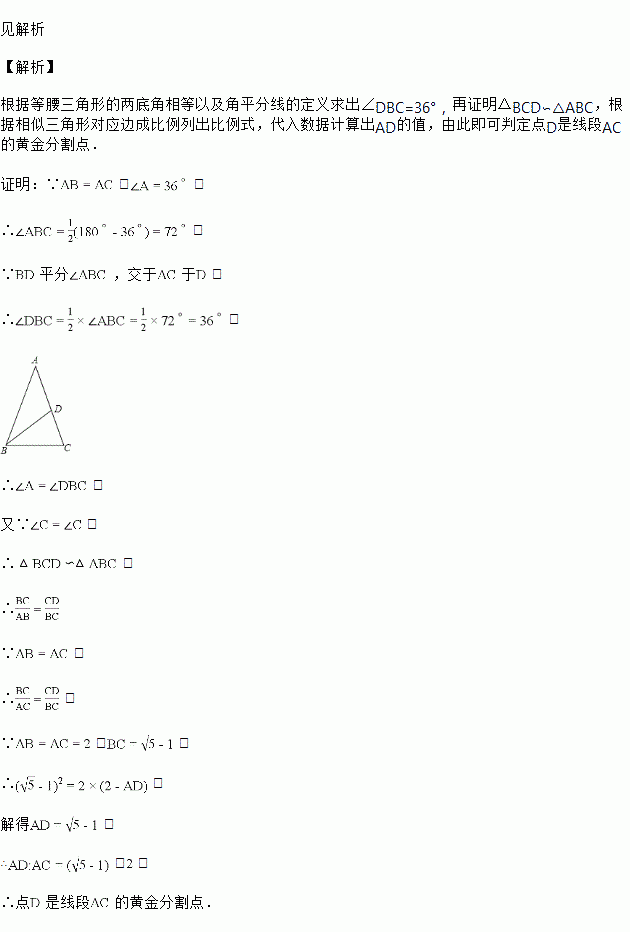 在中,,,,平分,交于于.试说明点是线段的黄金分割点.
