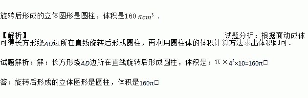 已知长方形ABCD的长为10cm,宽为4cm,将长方形绕AD边所在直线旋转后形成一个什么立体图形?这个立体图形的体积是多少?