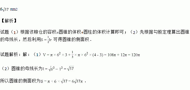 如图所示的粮仓可以看成圆柱体与圆锥体的组合体,已知其底面半径为6 m,高为4 m,下方圆柱高为3 m.