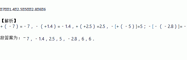 ﹣7,﹣1.4,2.5,5,﹣2.8,6,6 【解析】+(﹣7)=﹣7,﹣(+1.4)=﹣1.4,+(+2.5)=2.5,﹣[+(﹣5)]=5;﹣[﹣(﹣2.8)]=﹣2.8,﹣(﹣6)=6,﹣[﹣(+6)]=6. 故答案为:﹣7,﹣1.4,2.5,5,﹣2.8,6,6.
