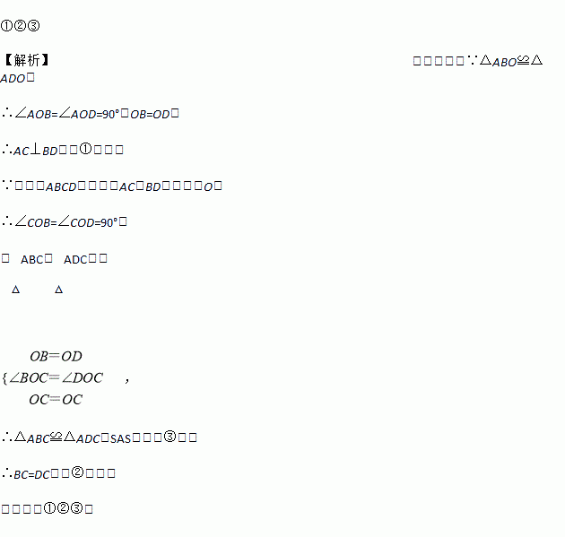 如图,四边形ABCD的对角线AC,BD相交于点O, △ABO≌△ADO。下列结论:①AC⊥BD;②CB=CD;③△ABC≌△ADC;④DA=DC.其中正确结论的序号是______________。