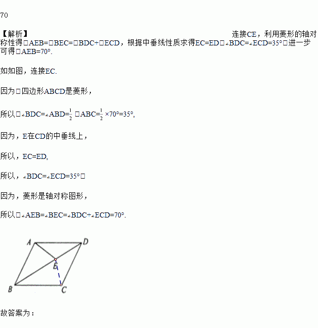 如图,在菱形ABCD中,点E为线段CD的中垂线与对角线BD的交点,连接AE。∠ABC=70°,则∠AEB=______°.