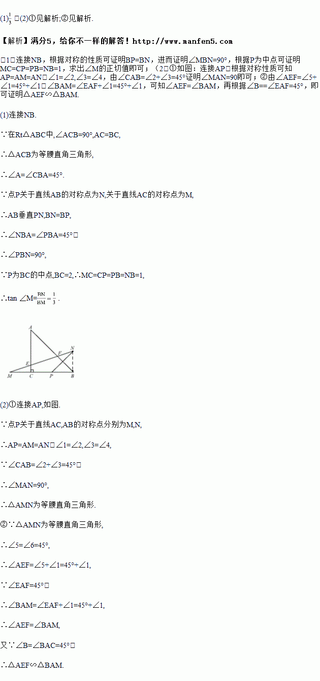 在Rt△ABC中,∠ACB=90°,AC=BC=2,点P为BC边上的一个动点(不与点B,C重合).点P关于直线AC,AB的对称点分别为M,N,连接MN交AC于点E,交AB于点F.
