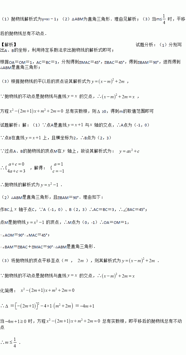 (3)把抛物线与直线y=x的交点称为抛物线的不动点.若将(1)中抛物线平移,使其顶点为(m,2m),当m满足什么条件时,平移后的抛物线总有不动点.