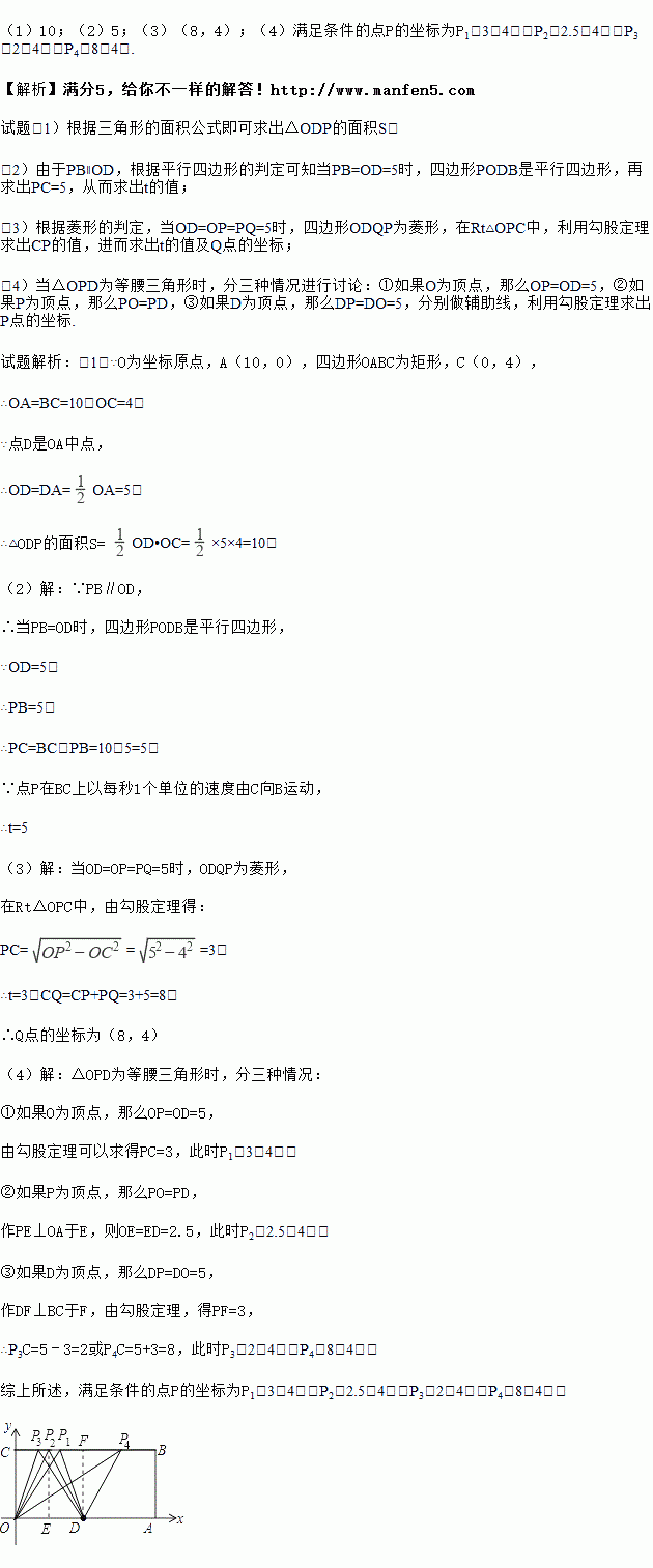 ÒÑÖª£ºÈçͼ£¬OÎª×ø±êԵ㣬ËıßÐÎOABCΪ¾ØÐΣ¬A£¨10£¬0£©£¬C£¨0£¬4£©£¬µãDÊÇOAÖе㣬µãPÔÚBCÉÏÒÔÿÃë1¸öµ¥Î»µÄËÙ¶ÈÓÉCÏòBÔ˶¯£¬ÉèÔ˶¯Ê±¼äΪtÃ룮