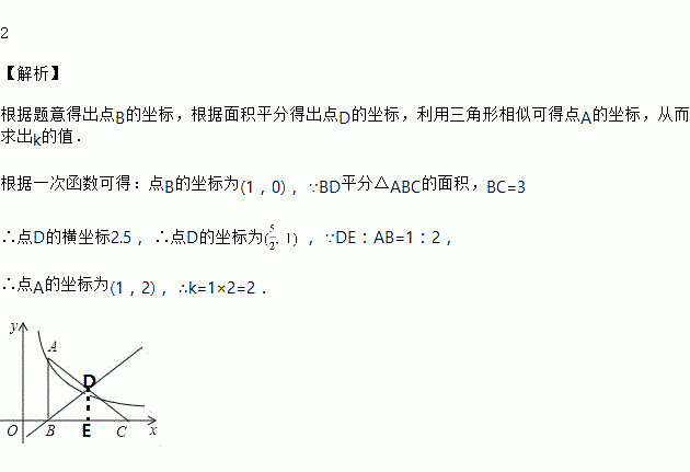 如图,Rt△ABC的直角边BC在x轴上,直线y=x﹣经过直角顶点B,且平分△ABC的面积,BC=3,点A在反比例函数y=图象上,则k=_______.