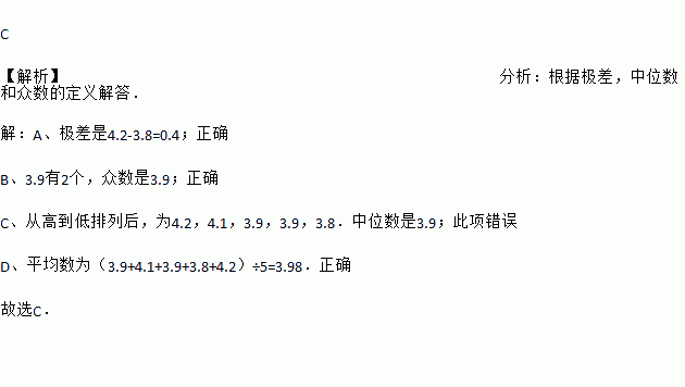 A. 极差是0.4 B. 众数是3.9 C. 中位数是3.98 D. 平均数是3.98