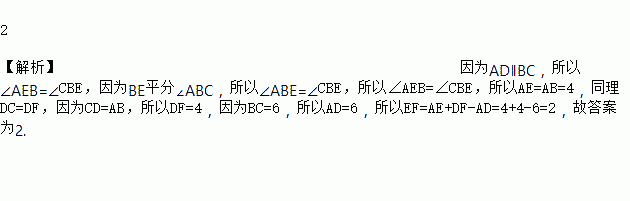 已知:如图,平行四边形ABCD中,BE平分∠ABC交AD于E,CF平分∠BCD交AD于F,若AB=4,BC=6,则EF=_____.