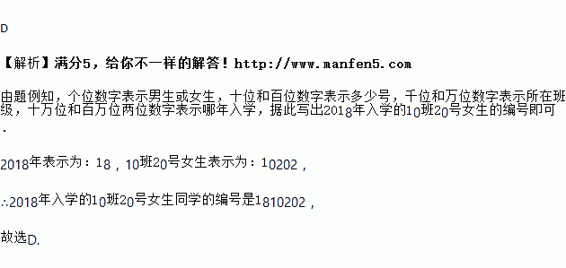 我县某中学为便于管理,决定给每个学生编号,设定末尾用1表示男生,2表示女生.如果编号1703231表示“2017年入学的3班23号学生,是位男生”,那么2018年入学的10班20号女生同学的编号为( )