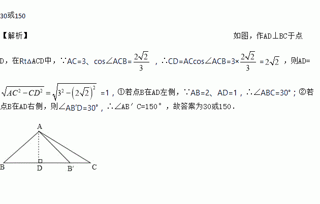 在△ABC中,AB=2,AC=3,cos∠ACB=,则∠ABC的大小为_____度.