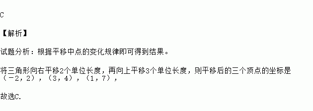如图,将三角形向右平移2个单位长度,再向上平移3个单位长度,则平移后的三个顶点的坐标是( ).