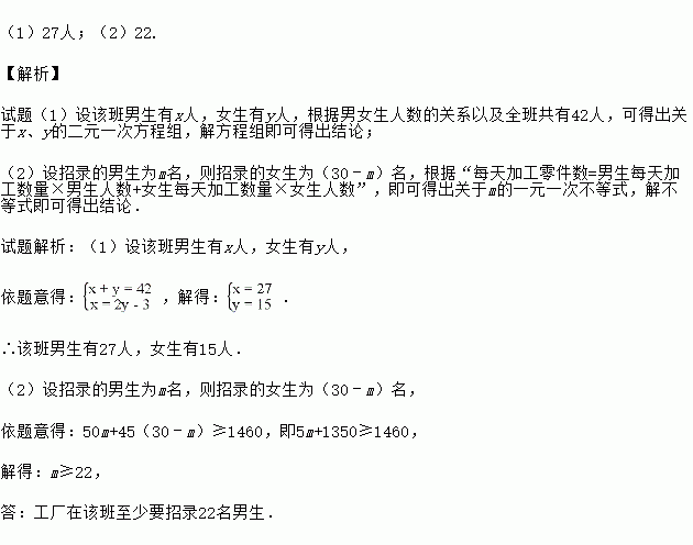 (2)某工厂决定到该班招录30名学生,经测试,该班男、女生每天能加工的零件数分别为50个和45个,为保证他们每天加工的零件总数不少于1460个,那么至少要招录多少名男生?