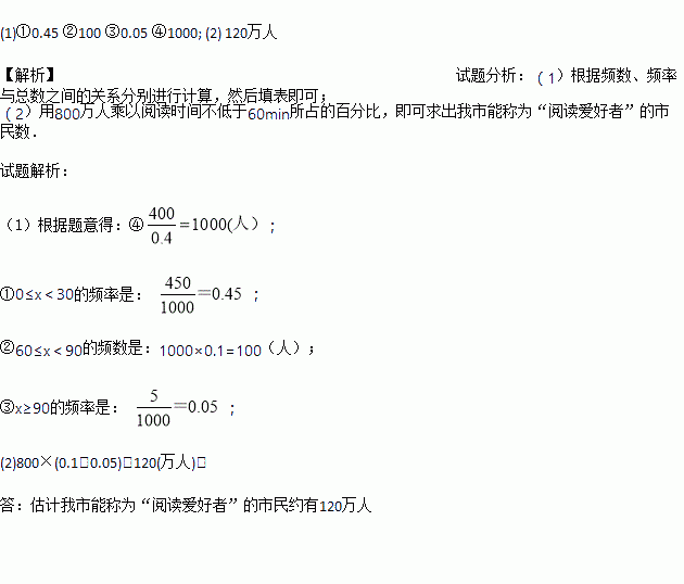 (2)½«Ã¿ÌìÔĶÁʱ¼ä²»µÍÓÚ60minµÄÊÐÃñ³ÆÎª¡°ÔĶÁ°®ºÃÕß¡±£¬ÈôÎÒÊÐÔ¼ÓÐ800ÍòÈË£¬Çë¹À¼ÆÎÒÊÐÄܳÆÎª¡°ÔĶÁ°®ºÃÕß¡±µÄÊÐÃñÔ¼ÓжàÉÙÍòÈË£®
