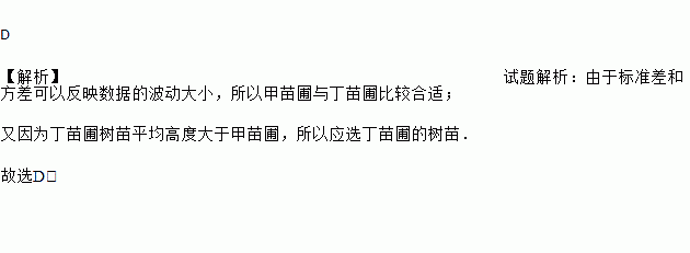 D 【解析】试题解析:由于标准差和方差可以反映数据的波动大小,所以甲苗圃与丁苗圃比较合适; 又因为丁苗圃树苗平均高度大于甲苗圃,所以应选丁苗圃的树苗. 故选D.