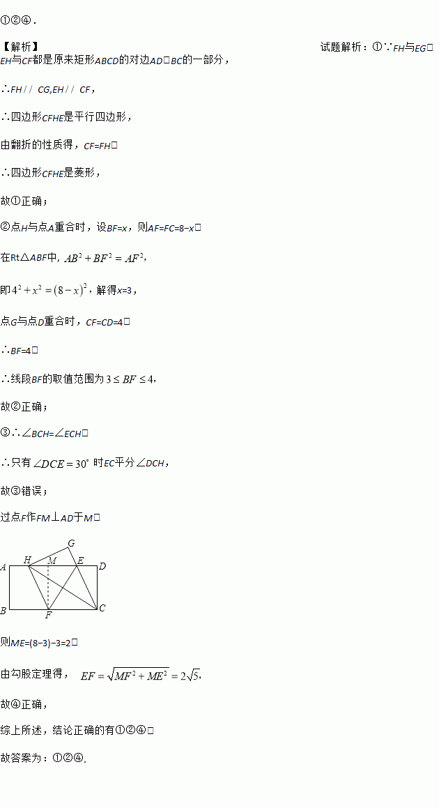 ①四边形CFHE是菱形;②线段BF的取值范围为3≤BF≤4;