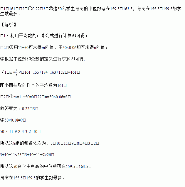 (1)小丽用简单随机抽样的方法从这50个数据中抽取一个容量为5的样本:161,155,174,163,152,请你计算小丽所抽取的这个样本的平均数;