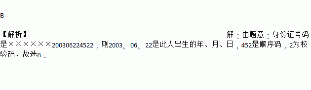 身份证号码告诉我们很多信息,某人的身份证号码是××××××199704010012,其中前六位数字是此人所属的省 (市、自治区)、市、县 (市、区) 的编码,1997、04、01是此人出生的年、月、日,001是顺序码,2为校验码.那么身份证号码是××××××200306224522的人的生日是( )