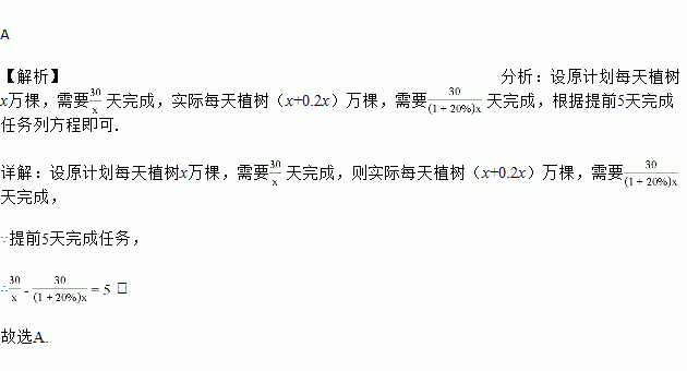 在创建文明城市的进程中,临沂市为美化城市环境,计划种植树木30万棵,由于志愿者的加入,实际每天植树比原计划多20%,结果提前5天完成任务,设原计划每天植树x万棵,可列方程是( )