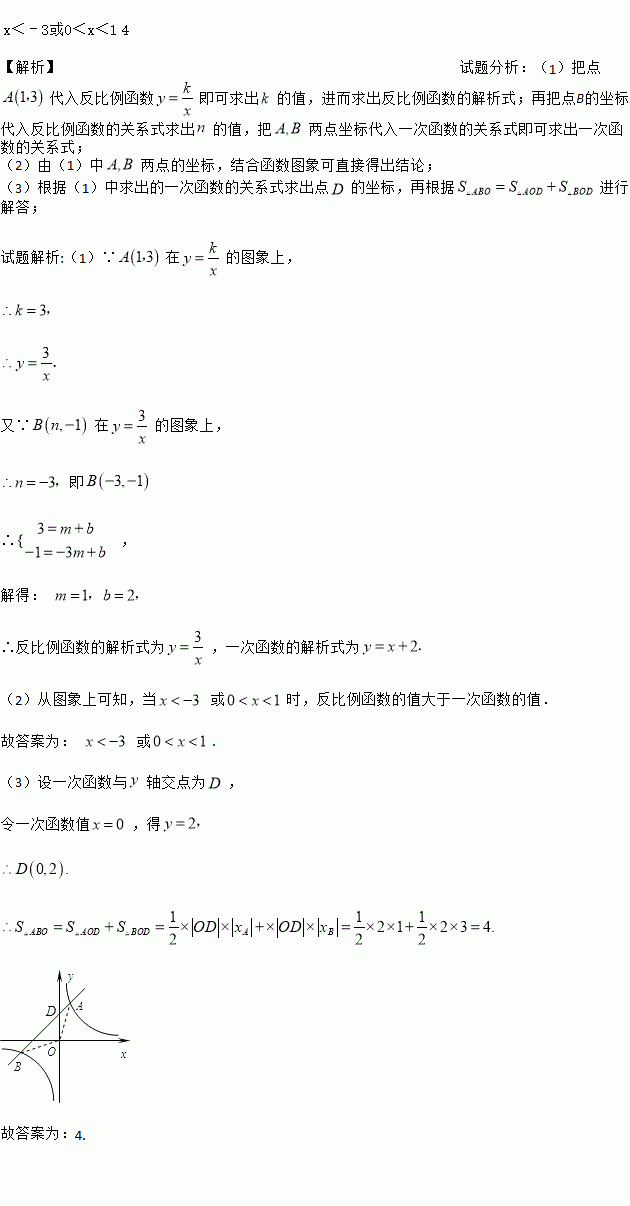 的图象与一次函数y=mx+b的图象交于两点A(1,3),B(n,-1).