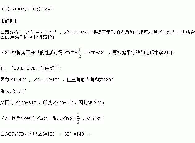 (1)BF∥CD;(2)148° 【解析】 试题分析:(1)由∠B=42°,∠1=∠2+10°根据三角形的内角和定理可求得∠2=64°,再结合∠ACD=64°即可证得结论; (2)根据角平分线的性质可得∠DCE=∠ACD=32°,再根据平行线的性质求解即可. 【解析】 (1)BF∥CD,理由如下: 因为∠B=42°,∠1=∠2+10°,且三角形内角和为180° ...