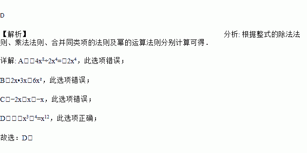 A. ﹣4x8÷2x4=﹣3x2 B. 2x•3x=6x C. ﹣2x+x=﹣3x D. (﹣x3)4=x12