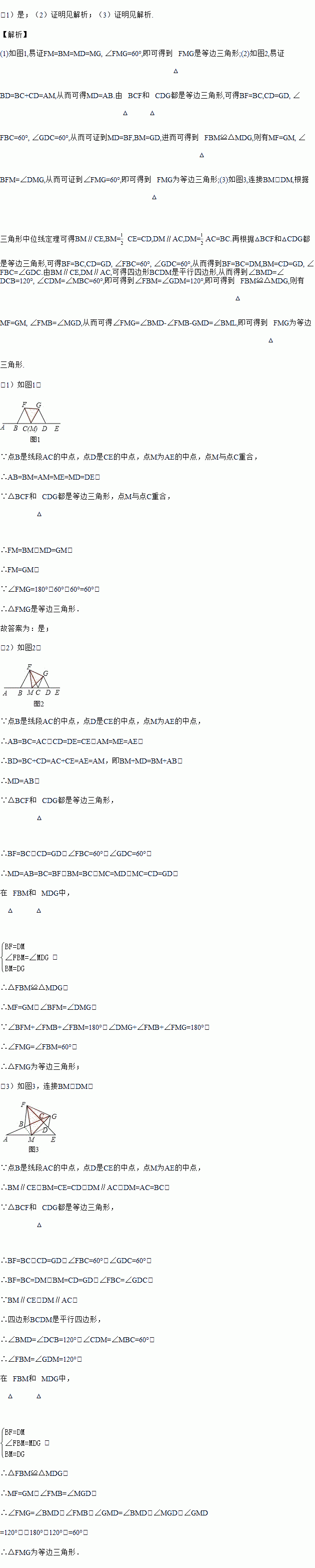 在图1至图3中,点B是线段AC的中点,点D是CE的中点,△BCF和△CDG都是等边三角形,点M为AE的中点,连接FG.