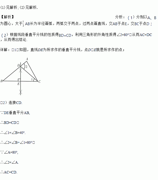 (1)求作线段BC的垂直平分线DE,垂足为E,交AB于点D;(要求;尺规作图,保留作图痕迹,不写作法)