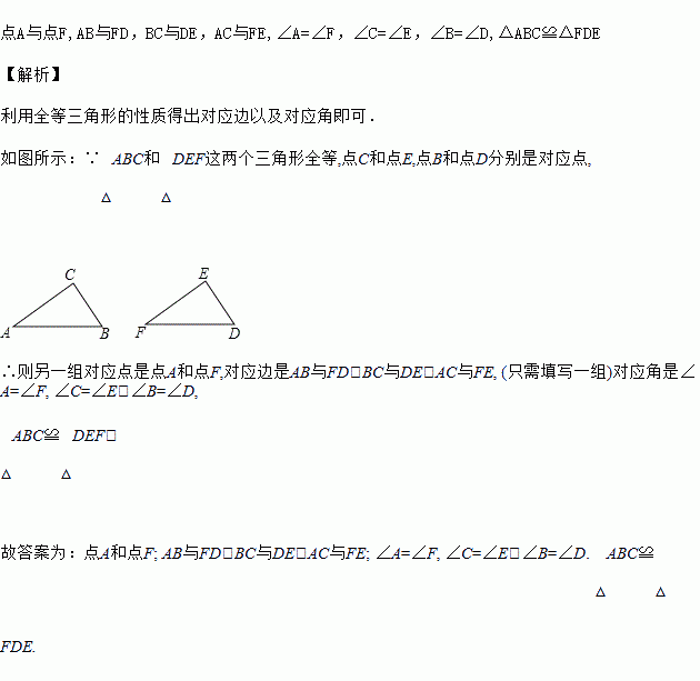 如果△ABC和△DEF这两个三角形全等,点C和点E,点B和点D分别是对应点,则另一组对应点是________,对应边是______________,对应角是_____________,表示这两个三角形全等的式子是___________.