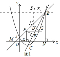 (2)点P是线段AB上一点,点D是线段BC上一点,PD∥x轴,射线PD与抛物线交于点G,过点P作PE⊥x轴于点E,PF⊥BC于点F.当PF与PE的乘积最大时,在线段AB上找一点H(不与点A,点B重合),使GH+$\frac{\sqrt{2}}{2}$BH的值最小,求点H的坐标和GH+$\frac{\sqrt{2}}{2}$BH的最小值;