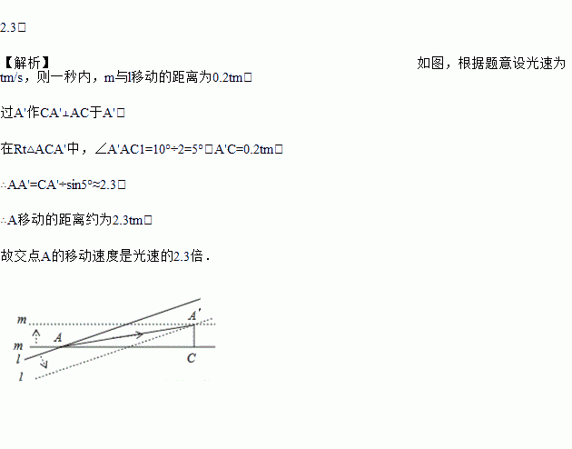 ¸ù¾Ý°®Òò˹̹µÄÏà¶ÔÂÛ¿ÉÖª£¬ÈκÎÎïÌåµÄÔ˶¯ËٶȲ»Äܳ¬¹ý¹âËÙ£¨3¡Á105km/s£©£¬ÒòΪһ¸öÎïÌå´ïµ½¹âËÙÐèÒªÎÞÇî¶àµÄÄÜÁ¿£¬²¢ÇÒʱ¹â»áµ¹Á÷£¬ÕâÔÚÏÖʵÖÐÊDz»¿ÉÄܵ쮵«ÎÒÃÇ¿ÉÈÃÒ»¸öÐéÄâÎﳬ¹âËÙÔ˶¯£¬ÀýÈ磺ֱÏßl£¬m±íʾÁ½Ìõľ°ôÏཻ³ÉµÄÈñ½ÇµÄ¶ÈÊýΪ10¡ã£¬ËüÃÇ·Ö±ðÒÔÓë×ÔÉí´¹Ö±µÄ·½ÏòÏòÁ½²àÆ½ÒÆÊ±£¬ËüÃǵĽ»µãAÒ²Ëæ×ÅÒÆ¶¯£¨Èçͼ¼ýÍ·Ëùʾ£©£¬Èç¹ûÁ½ÌõÖ±ÏßµÄÒÆ¶¯Ëٶȶ¼ÊǹâËÙµÄ0.2±¶£¬Ôò½»µãAµÄÒÆ¶¯ËÙ¶ÈÊǹâËÙµÄ_____±¶£®£¨½á¹û±£ÁôÁ½¸öÓÐЧÊý×Ö£©£®