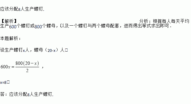 应该分配8人生产螺钉. 【解析】分析:根据每人每天平均生产600个螺钉或800个螺母,以及一个螺钉与两个螺母配套,进而得出等式求出即可. 本题解析: 设生产螺钉x人,螺母(20-x)人, , x=8, 答:应该分配8人生产螺钉.