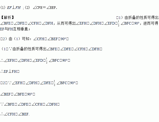 如图,将长方形纸片的一角斜折过去,点B落在点D处,EF为折痕,再把FC折过去与FD重合,FH为折痕,问: