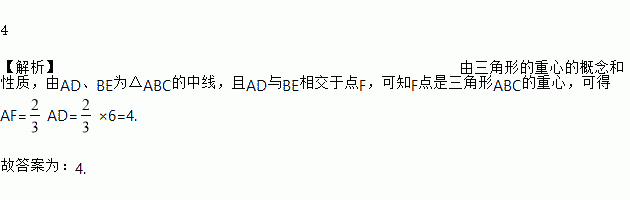 4 【解析】由三角形的重心的概念和性质,由AD、BE为△ABC的中线,且AD与BE相交于点F,可知F点是三角形ABC的重心,可得AF=AD=×6=4. 故答案为:4.