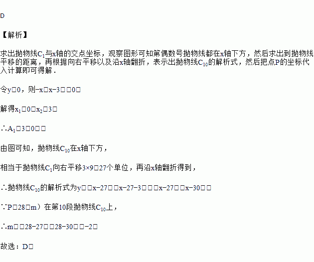 如图一段抛物线:y=﹣x(x﹣3)(0≤x≤3),记为C1,它与x轴交于点O和A1;将C1绕A1旋转180°得到C2,交x轴于A2;将C2绕A2旋转180°得到C3,交x轴于A3,如此进行下去,直至得到C10,若点P(28,m)在第10段抛物线C10上,则m的值为( )