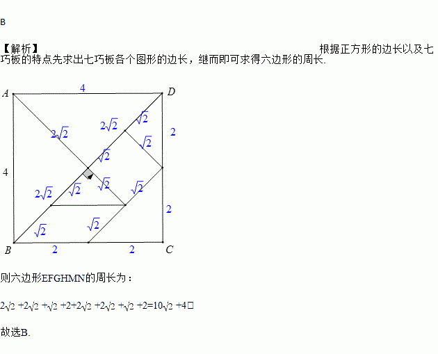 已知图2是由图1七巧板拼成的数字“0”,己知正方形ABCD的边长为4,则六边形EFGHMN的周长为( )