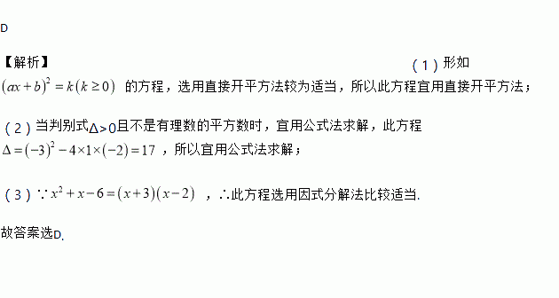 D 【解析】(1)形如 的方程,选用直接开平方法较为适当,所以此方程宜用直接开平方法; (2)当判别式Δ>0且不是有理数的平方数时,宜用公式法求解,此方程,所以宜用公式法求解; (3)∵ ,∴此方程选用因式分解法比较适当. 故答案选D.