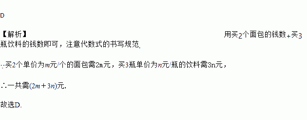 嘉嘉购买2个单价为m元/个的面包和3瓶单价为n元/瓶的饮料,所需钱数为( )