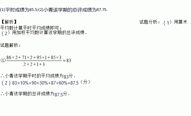 (2)如果学期的总评成绩是根据下图所示的权重计算的,请计算出小青该学期的总评成绩.