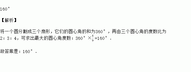 将一个圆分割成三个扇形,使它们圆心角度数比为2:3:4,则这3个圆心角中度数最大的为 ________.