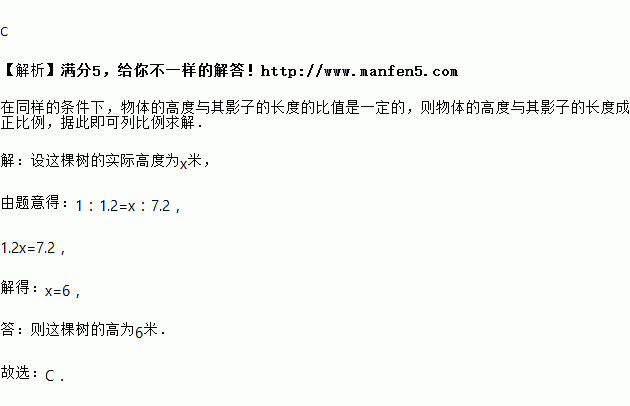 小明拿米的竹竿立于地面,测其影长为米,同一时刻测得一棵树在太阳光下的影长为米,则这棵树的高为( )