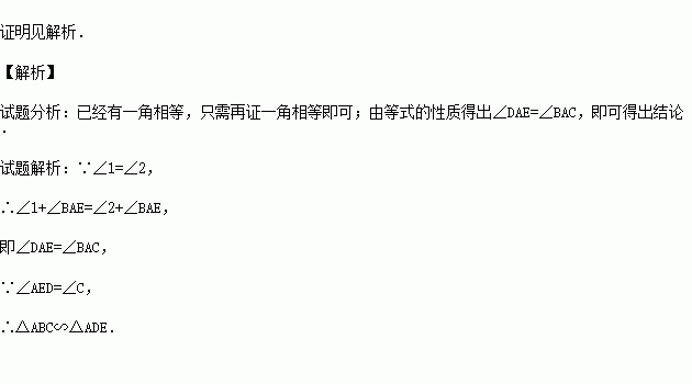 如图,已知∠1=∠2,∠AED=∠C,求证:△ABC∽△ADE