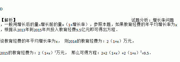 D 【解析】试题分析:增长率问题,一般用增长后的量=增长前的量×(1+增长率),参照本题,如果教育经费的年平均增长率为x,根据从2013年到2015年共投入教育经费9.5亿元即可得出方程. 设教育经费的年平均增长率为x, 则2014的教育经费为:2(1+x)万元, 2015的教育经费为:2(1+x)2万元, 那么可得方程:2+2(1+x)+2(1+x)2=9.5.