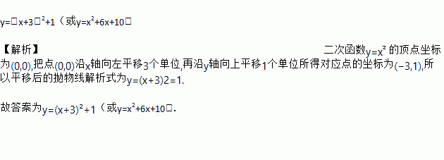 y=(x+3)2+1(或y=x2+6x+10) 【解析】二次函数y=x²的顶点坐标为(0,0),把点(0,0)沿x轴向左平移3个单位,再沿y轴向上平移1个单位所得对应点的坐标为(?3,1),所以平移后的抛物线解析式为y=(x+3)2=1. 故答案为y=(x+3)²+1(或y=x2+6x+10).